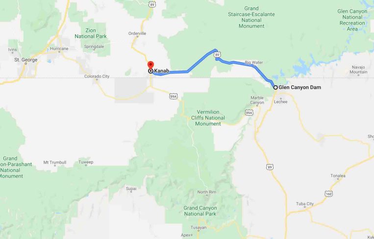 (Glen Canyon Dam → Kanab Via U.S. Route 89 [70.5miles @ 1hr 6min])