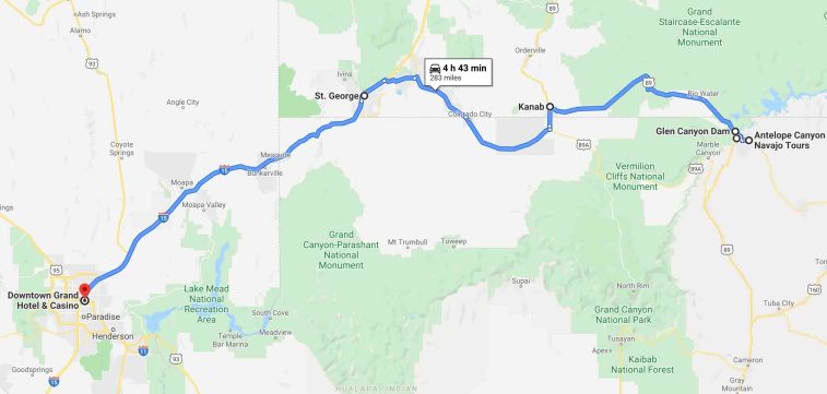 Page → Antelope Canyon → Glen Canyon Dam → Kanab → St George → Downtown Grand Hotel & Casino [283miles @ 4hr 43min]
