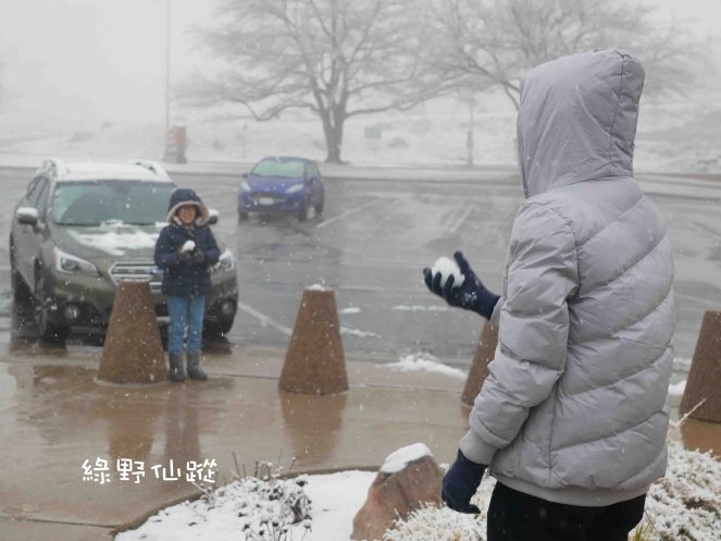 QE和妹妹卻在遊客中心前打起雪戰,久久不願離去。