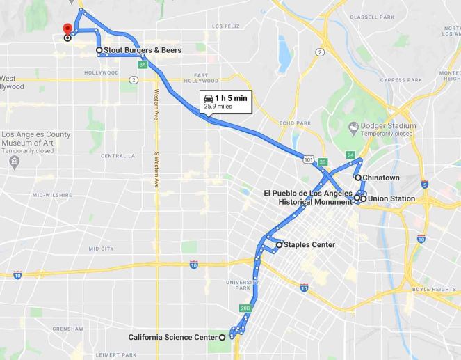 今日行程 >> 酒店 (Uber) > 加州科學中心 (Uber) > 史坦波中心球場 (Uber) > 唐人街 (徒步) > 洛杉磯歷史古城區 (徒步) > 聯合車站 (地鐵) > Trader Joe’s (徒步) > Stout Burger (Uber) > 酒店