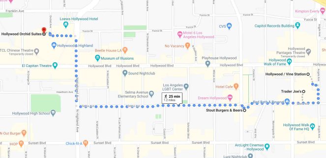搭乘地鐵紅線至Hollywood / Vine站,徒步約7分鐘