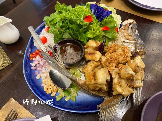Crispy Fried Seabass with Betel Leaf Parcel and Herbs Condiment Baht680