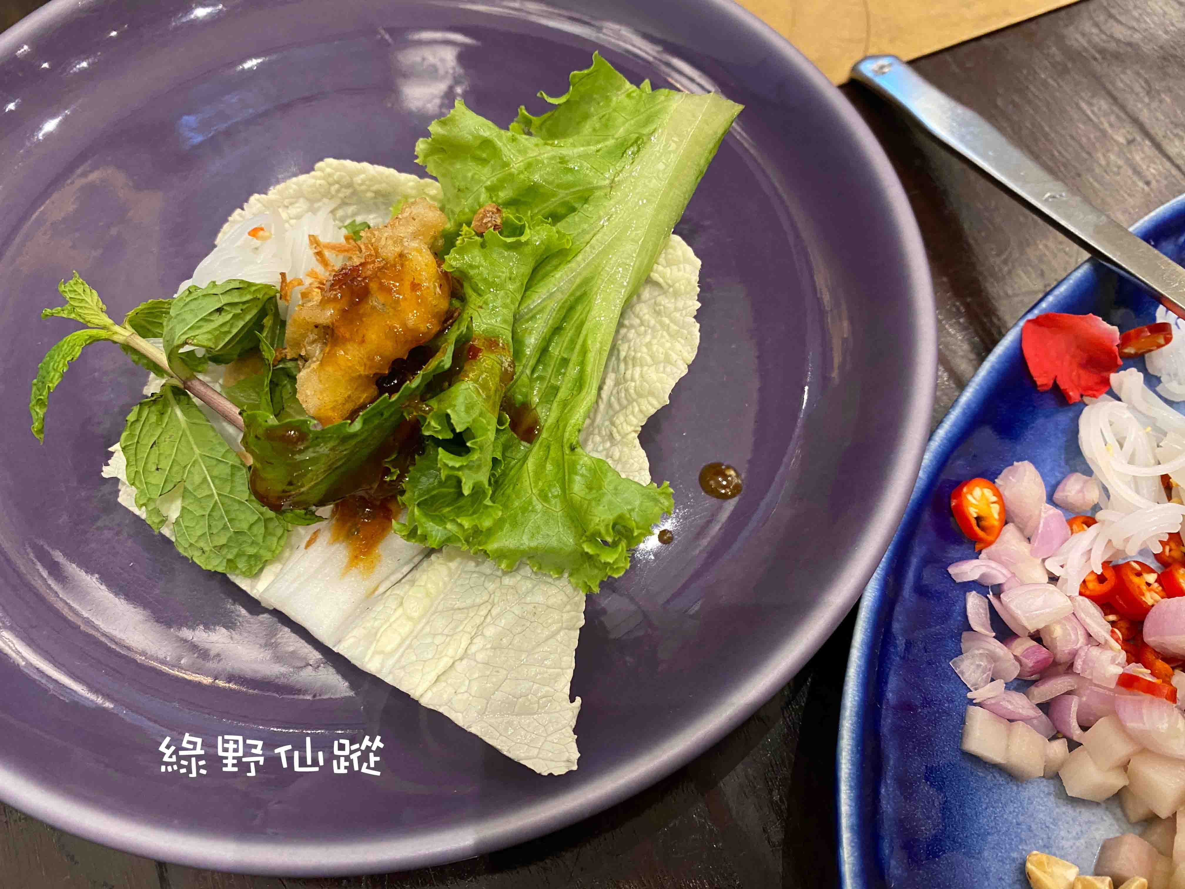 侍應生推薦的傳統泰菜,食用法類似韓式的菜包肉吃法。